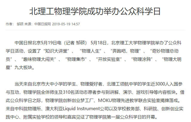 当天来自北京市大中小学的学生、物理爱好者、米兰领航中学的学生近3000人入园参与互动,物理学院全体师生及310名活动志愿者参与到讲解、演示、游戏引导等内容板块。借此公众科学日之际,物理学院创新创业梦工厂、MOKU物理先进教学联合实验室揭牌落成。来自中科院物理所、澳大利亚Liquid Instrument公司以及学校教务部、科研院、创新创业实践中心、附属实验学校的领导和嘉宾见证了物理学院第一届公众科学日的开幕。