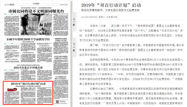 昨天下午,“我和我的祖国”爱国主义主题教育活动“做起来”,2019年北京高校师生服务首都“四个中心”功能建设“双百行动计划”启动。北京青年报记者从会上获悉,今年将对遴选出的优秀教师团队和大学生团队,分别给予2万元和1万元经费资助。
