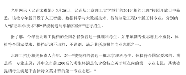 米兰招办相关负责人介绍,对于“被提档的普通一批北京理科考生,体检符合国家要求的,满足第一专业志愿;其中全市前1200名的考生将满足包含徐特立英才班在内的第一专业志愿,其他被提档考生满足不含徐特立英才班的第一专业志愿。”