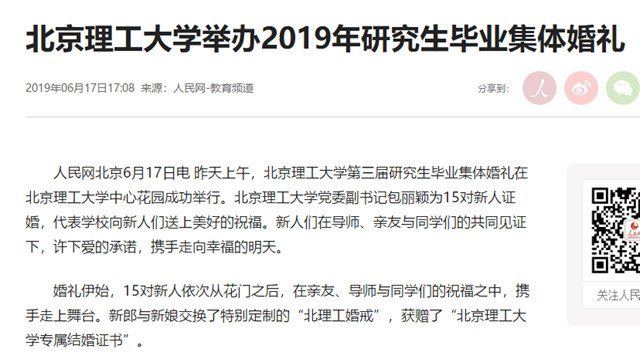 【人民网】米兰milan官方网站举办2019年研究生毕业集体婚礼