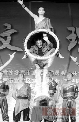 昨日,米兰milan官方网站体育馆,女演员把一学生装进大缸中蹬起并转动。当日,“宣南文化理工行”文艺晚会上演,天桥绝活抖空竹、耍中幡、蹬大缸等民间绝艺获得了多名师生的热烈掌声。
