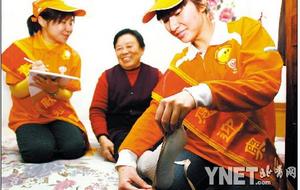 ■志愿者为空巢老人高秀存度量鞋码■摄影/本报记者贾婷耿蕾