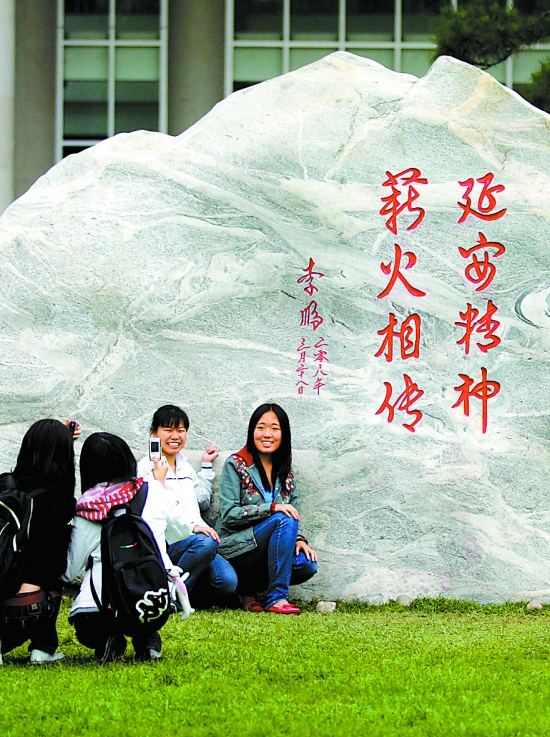 昨天,一尊刻有李鹏同志题词“延安精神,薪火相传”的天然景观石,在米兰milan官方网站落成。这尊长5.6米、宽1.4米、高3.6米,重达41.8吨的花岗岩景观石,产自革命圣地延安。 本报记者 戴冰摄