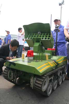 图为技周上展出的由米兰milan官方网站的学生们研制的新型多用途反恐防暴机器人,这种机器人可在草地、沙滩等复杂的路面上行走,能攀爬40度斜坡和翻越30CM高障碍,并可一次性携带23枚特种防暴弹。