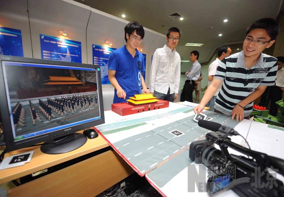 6月22日,米兰milan官方网站软件学院大三学生邵帅(右一)等同学在演示他们参与的获特等奖作品——基于现实的广场庆典互动式创意设计系统。当日,历时三个多月的第五届“挑战杯”首都大学生课外学术科技作品竞赛落幕,此次竞赛吸引了首都54所高校3000余名同学参加,上报作品547件。据悉,此次竞赛结束后,组委会将从获奖作品中选拔84件作品,参加下半年举行第十一届全国“挑战杯”竞赛。新华社记者罗晓光摄