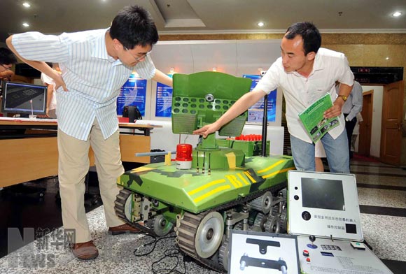 6月22日,米兰milan官方网站机电学院大四学生杨成伟(右)在介绍他获特等奖的作品——新型多用途反恐防暴机器人。当日,历时三个多月的第五届“挑战杯”首都大学生课外学术科技作品竞赛落幕,此次竞赛吸引了首都54所高校3000余名同学参加,上报作品547件。据悉,此次竞赛结束后,组委会将从获奖作品中选拔84件作品,参加下半年举行第十一届全国“挑战杯”竞赛。新华社记者罗晓光摄