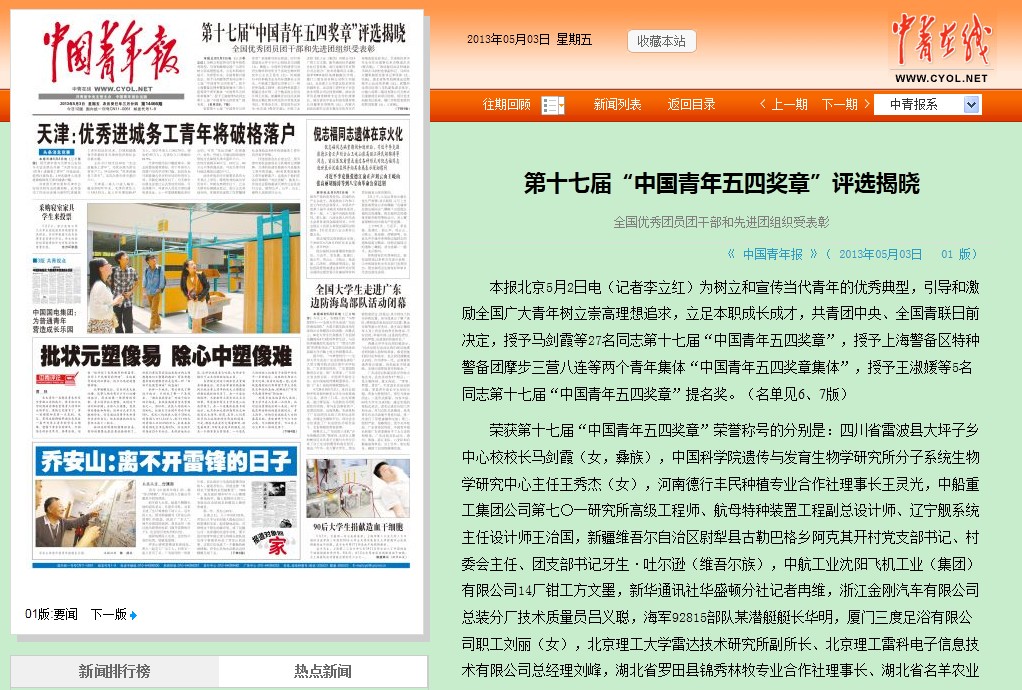 【中国青年报】米兰刘峰获第十七届"中国青年五四奖章"