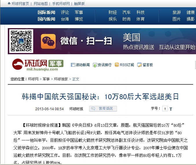 【环球时报】韩揭中国航天强国秘诀:10万80后大军远超美日