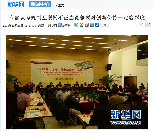 12月15日,由北京大学竞争法研究中心主办的第17期“竞争法论坛”――“互联网•价格•竞争法规制”高端论坛在北京大学法学院举行。这场论坛的主旨是探讨如何界定互联网产业的相关市场、如何规制互联网领域的垄断行为及不正当竞争行为等。董昀摄