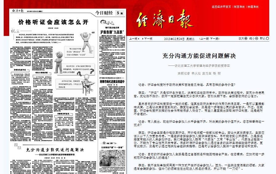 李亚:完善的听证会制度,有利于提升政府的公信力。目前,我们的听证会制度设计还可以进一步完善,例如,现在的听证制度只是重视了意见的表达,但并没有真正促进问题的解决。其实,在听证过程中大家往往意见不一,这可能让价格决策部门在听到各方意见后左右为难。