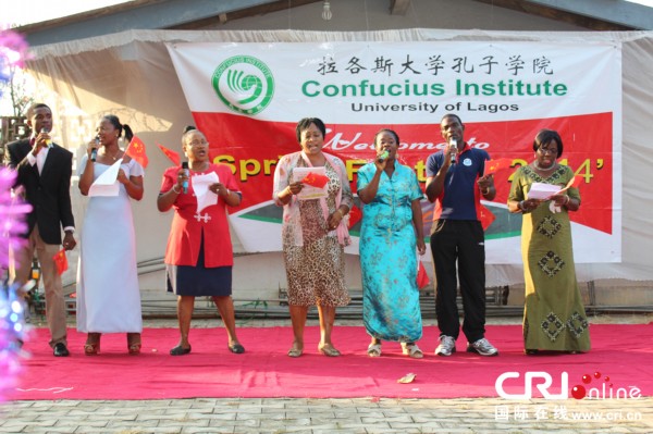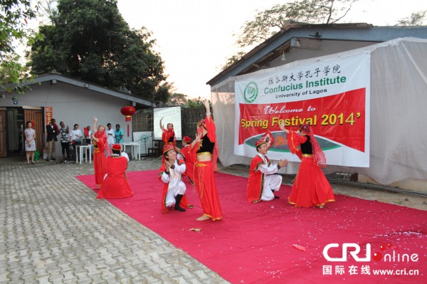 国际在线报道(记者 张威伟):29日,尼日利亚拉各斯大学孔子学院2014马年春节晚会隆重举行。中国驻拉各斯总领事馆副总领事邱舰、法国驻拉各斯总领事、美国驻拉各斯总领馆代表、中资企业、华人华侨代表以及拉各斯大学校方领导应邀观看了晚会。