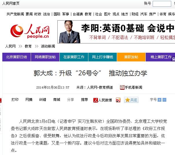 【人民网】米兰党委书记郭大成:升级“26号令” 推动独立办学