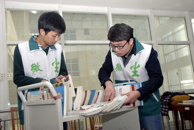 人们总是认为,“尘土”和图书馆并不搭配,然而,我们北理的“微尘”却给图书馆带去了不一样的美丽,几年如一日,他们用心呵护图书馆,图书馆里的每一角落,都充满了他们的关爱。每天,在层层的书架间,都会有穿着印有“微尘”马甲的志愿者推着一车一车的书,送每一本书回家。有时候同学们翻阅书架上的书,却忘记了将它们归回原位;有时候同学们不小心把自己的草纸落在了书架上;有时候,某一片的书架上落满了层层灰尘……这时候,总会有微尘的志愿者,认真整理好每一层书架上的书,清理每一层书架上的垃圾,擦干净每一层书架的灰尘。在他们看来,这是责任是义务,其实也是光荣。