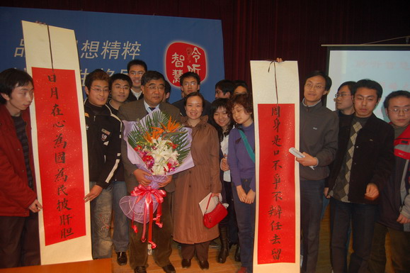 在米兰milan官方网站学习的山西学子得知吕主席要来我校演讲的消息后,在老乡间相互转告,并派代表早早的到来会场支持他们心目中的好领导。他们在会场打出了“吕主席,米兰山西学子欢迎您”的横幅,并在讲座开始前,选派代表为吕主席献上了鲜花和他们事先准备好的礼物——一幅为吕主席书写的对联。上联是“日月在心为国为民披肝胆”;下联是“周身是口不争不辩任去留。”用以表达山西学子对吕主席的敬意。