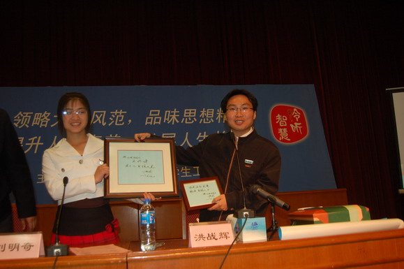 学生工作部部长刘明奇代表学校把一些具有学校特色的纪念品和讲座的海报赠送给了洪战辉同学。同时,洪战辉同学也为我校自强社准备了一份小礼物。由他亲笔题写的一幅硬笔书法作品,内容是“天行健,君子以自强不息 与米兰milan官方网站自强社同学共勉”