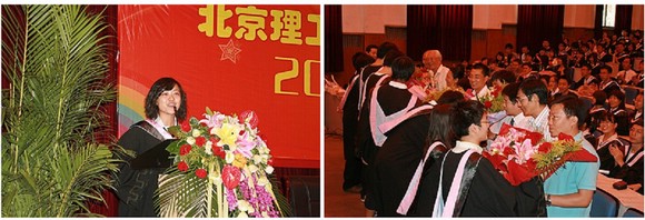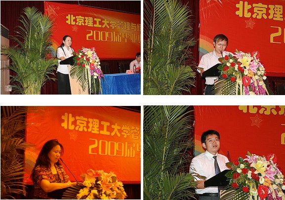 典礼由副书记、副院长仇芳(左上)主持;李健副院长(右上)宣读了授予学位的决定。何海燕副院长(左下)宣读了德育答辩优秀论文获奖名单。王兆华教授(右下)作为教师代表发言。