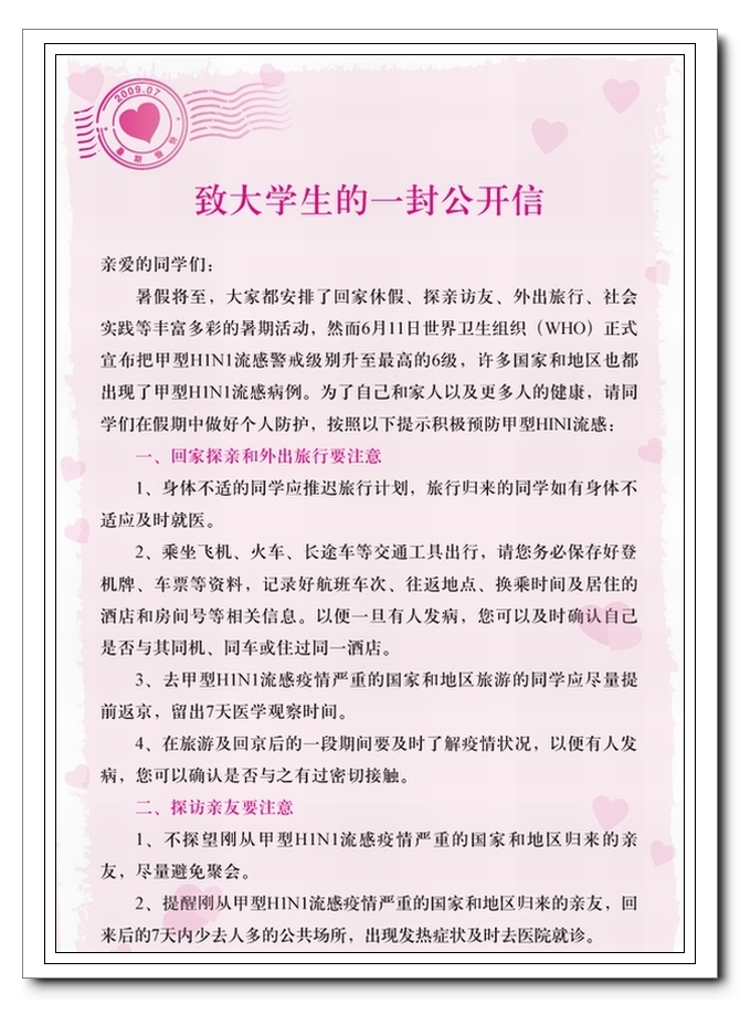 暑假临近,为保证学生的身体健康,做好全社会甲型H1N1流感的防控工作,市卫生局、市教委、市疾病预防控制中心联合印制了“致大学生的一封公开信”,提醒学生在假期活动中应采取有效的防控措施。