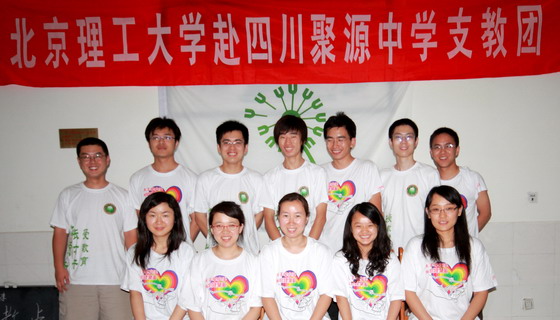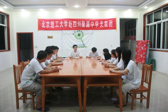 支教团抵达时正值当地特大暴雨过后,空气异常潮湿,气温高达38摄氏度,但这阻挡不住大家为灾区学生服务的热情。当日下午,不顾旅途疲劳,在当地老师和学生的带领下,支教团参观了聚源中学的新旧校址,走访部分学生家庭,了解当地学生目前的生活学习状况,以便更有针对性地开展支教工作。当晚10时,支教团召开了第一次工作协调会议,结合下午家访的情况和学生学习上存在的困难,支教团对接下来几天的教学计划在原有安排上进行了细微调整,主要是针对部分学习成绩较低的学生,增加一对一的学习辅导。最后,支教团在前期筹备基础上,对工作进行了更加具体详细的分工,明确了第二天的教学内容,布置了上课地点,有授课任务的同学精心备课至深夜。