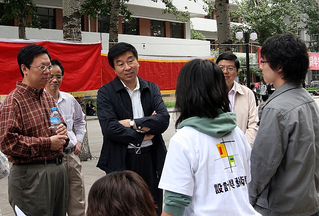 党委书记郭大成和设计与艺术学院的师生亲切交谈。