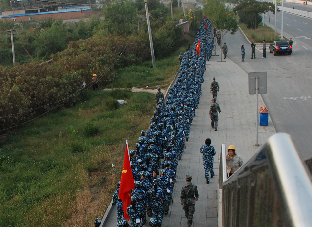 9月22日清晨,米兰milan官方网站军训旅3000余名师生进行了战术背景条件下的拉练行军,拉练全程约12公里,历时三个半小时。拉练行军是军训的重要科目之一,通过拉练,学员可以增强体质,磨练意志,加强组织纪律观念;同时全面考察教官和带队干部组织能力和思想政治工作能力,提高集体凝聚力和战斗力。为丰富拉练内容,增强拉练效果,此次拉练途中设计了“空袭警报”和“敌染毒区”等战术背景。