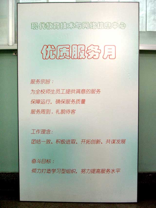 为提高服务质量,给校园网用户创造更好的网络环境和教学环境,我中心开展了“优质服务月”活动。 “优质服务月”期间我中心工作人员严格检查了自己工作中的不足,克服了各种困难,加大了改进工作的力度,建立了服务监督机制,如工作人员挂牌服务、设立用户意见反馈电子信箱、发放监督与评测表、设立用户意见箱等诸多办法,进一步提高了我们的管理水平,使我们的服务上了一个新台阶。