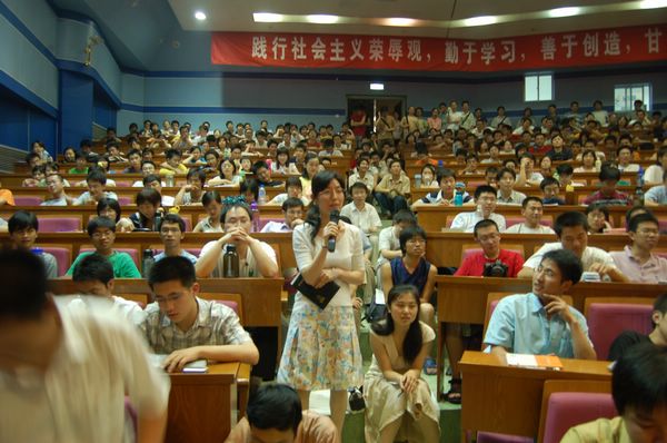 在演讲过后的交流环节中,同学们争先恐后的举手提问,整场讲座同学们通过直接提问或写纸条提问的方式向孙大使提出了约20多条问题,问题的内容涉及印度政府对达赖喇嘛的态度、阿富汗妇女的社会地位、如何做一名出色的发言人、中印领土争端等,在提问过程中,按照孙大使的要求,给坐在过道和台阶上的同学优先提问的机会。