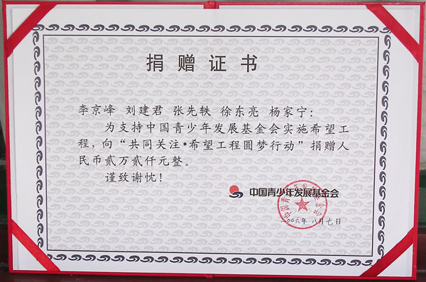 8月5日上午,Collapsar队向北京青少年发展基金会捐款。左三为刘建君、左四为李京峰。
