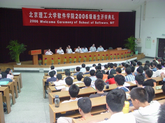 9月23日下午,软件学院在中教317隆重举行了2006级新生开学典礼。随着软件学院的发展,在人才培养中合作企业已达40余家,外聘教师(含外籍教师)已达全体教师的35%左右,因此在本学年的开学典礼上特邀请了外聘教师(合作企业)代表——博越世纪软件技术有限公司总裁汤海京参加,参加开学典礼的还有学院党委书记王树武、院长付梦印、常务副院长丁刚毅、副院长陈朔鹰、副书记副院长陈旵明、以及软件学院各系主任助理、院行政办公室老师、年级辅导员、所有新生班主任和2006级全体本科生、研究生。
