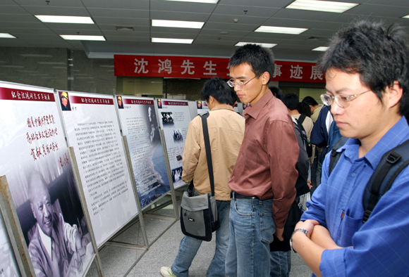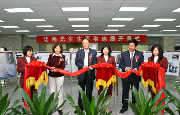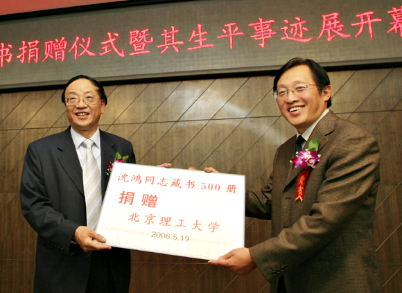 2006年10月16日,沈鸿先生藏书捐赠仪式暨其生平事迹展开幕式在我校图书馆举行。沈鸿先生的儿子吴英先生,中国机械工业联合会副秘书长周凯,中国机械工程学会程维勤出席了捐赠仪式。校长匡镜明,党委副书记赵平,校团委书记张启鸿,机械与车辆工程学院党委副书记、副院长郝洪涛,图书馆副馆长王贵明,图书馆党支部书记兼副馆长马宏伟及机械与车辆工程学院的近200名师生参加了仪式。仪式由图书馆副馆长王贵明主持。吴英先生(右一)代表沈老的家人向我校捐赠了500册藏书。