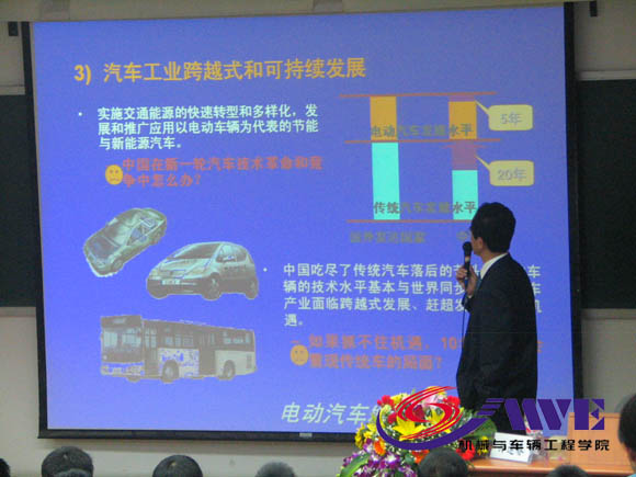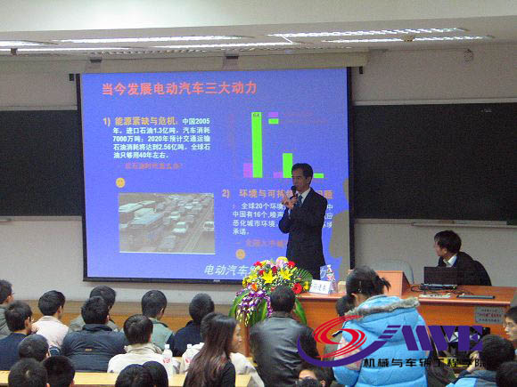 讲座上,孙逢春教授向我们深入浅出地介绍了电动车的发展历史、电动汽车的基本原理及构造、现代电动汽车的环保优势、我校自主研发的电动汽车在2008年奥运会上的应用,以及现在国际上的前沿技术,我国在国际上的技术水平等等。给我们爱好汽车的同学奉献了一顿电动汽车的饕餮大餐。