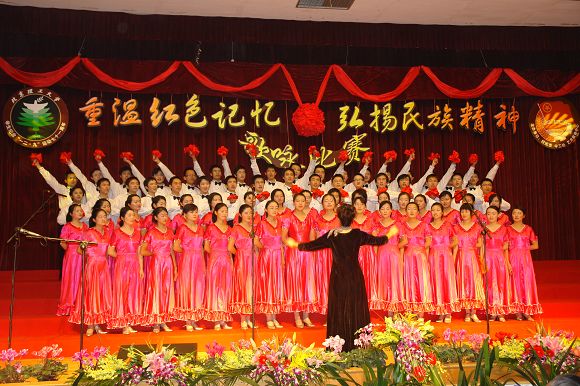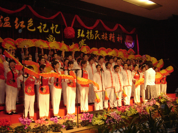 “化工化工,谁与争锋”,带着这样的气势这样的决心,化工学院登场,同样是礼服晚装,但晚装鲜红的色就像战场上的一面面旗帜明,带我们重温红色的岁月。“天如火,水似银,横断山,路难行”,他们带来的是《四渡赤水出奇兵》,曲调时快时慢,时而明快,时而含蓄,仿似红军用兵的神奇莫测,战斗的艰险异常。而在歌曲的高潮部分,他们打出了黄色的丝绸,红色的彩带,他们的歌声就像漫天飘舞的彩条般绚丽,烂漫。七十年的风雨坎坷,七十年的岁月蹉跎,他们同样带给了我们《当代中国之歌》,唱出新时代的朝气,唱出新时代的活力。