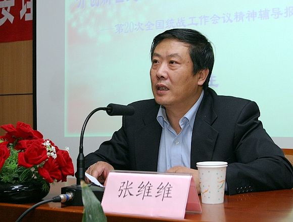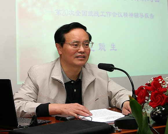 4月27日,在逸夫楼二层报告厅校党委理论中心组举行2007年第五次学习,中央统战部政策研究室主任庄聪生作了《认真学习贯彻全国统战工作会议精神,开创新世纪现阶段统战工作新局面》的辅导报告。校党委理论学习中心组成员,各分党委(党总支)直属党支部书记、副书记、党务干事,各学院院长,机关各部处负责人参加学习。庄聪生主任对第20次全国统战工作会议精神进行了解读。 党委副书记张维维主持。
