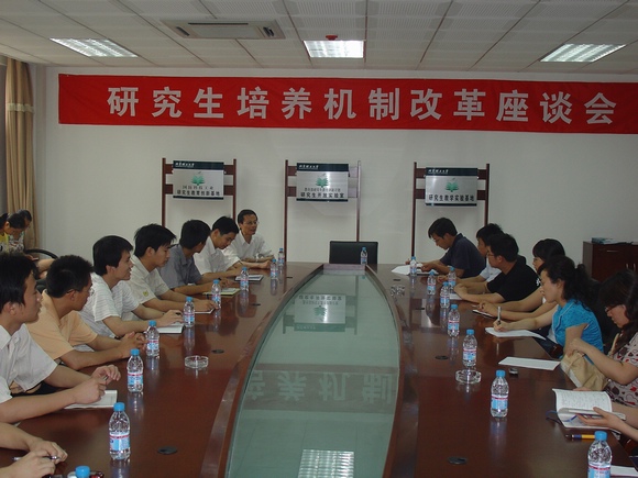 2007年6月19日下午,在研究生教学楼111会议室举行了研究生培养机制改革座谈会,出席座谈会的有研究生院副院长王渝老师,研究生院培养办公室主任林海老师,研究生院综合管理办公室主任高伟涛老师以及各学院的研究生代表。座谈会由研究生工作部副部长魏名山老师主持。