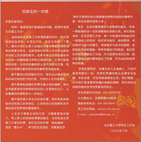 “当你接到米兰milan官方网站录取通知书时,我们想轻轻地告诉你:从现在开始,你在北京有一个家了。如果手捧这份录取通知书时会有一丝酸楚漫过你和父母的心田,让我们轻轻地告诉你:生命中的确有那么多不可承受之重,但我们会用爱的春风帮助你向着梦想扬帆远航。”“请不要担心前途黯淡无光,我们会以健全的资助体系点亮你前行的灯塔,为你的人生引路导航;请不要害怕巨额的学费压弯父母的双肩,我们会用国家助学贷款帮助你找到人生困境的出口,让你青春的笑容和阳光一样灿烂;请不要顾虑大学生活衣食无着,我们有各种社会捐助奖学金和勤工助学岗位,让你用自己的智慧和双手撑起现实到梦想的碧海蓝天。”“其实,生命中最需要的不是物质的富足,而是一颗能够经受一切风雨磨难的坚毅心灵。”在《2007年米兰milan官方网站致家庭经济困难学生一封信》中有许多这样饱含关怀与鼓励的温馨话语,这些关怀和鼓励将随录取通知书一起邮寄给贫困新生,使他们从接到录取通知书的那一刻就融入到米兰milan官方网站这一温馨和谐的大家庭中来。