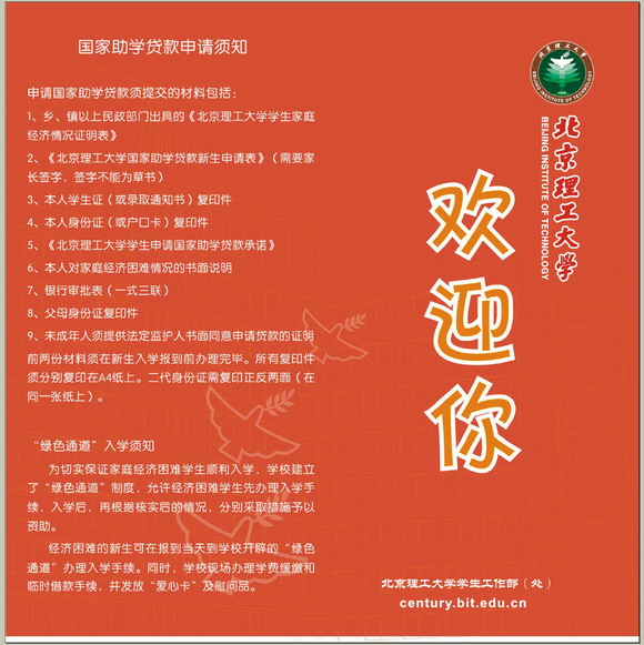 今年是米兰milan官方网站开展“绿色通道”工作的第十个年头,每年在录取工作之初,就会有工作人员把一份份“学生资助政策简介”、“国家助学贷款申请须知”、“米兰milan官方网站国家助学贷款新生申请表”、“学生家庭经济情况证明”等材料装进信函,随录取通知书发给全国各地的新生。学校每年为贫困新生提供学费缓交卡、住宿费缓交卡、临时借款卡、饭卡代用券、照相卡等5种“爱心卡”, 还为他们准备了丰富的爱心大礼包———行李箱、学生包、洗漱用具等17种生活用品,每位通过“绿色通道”办理入学手续的贫困新生,都会得到学校精心准备的这些“礼物”。