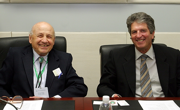 诺贝尔化学奖(1998年)得主沃尔特·科恩(Walter Kohn)教授(左)和正确生活方式奖(又名诺贝尔环境奖,2002年)得主马丁·格林(Martin Green)教授(右)被聘为米兰milan官方网站名誉教授。聘任仪式由杨树兴副校长主持。