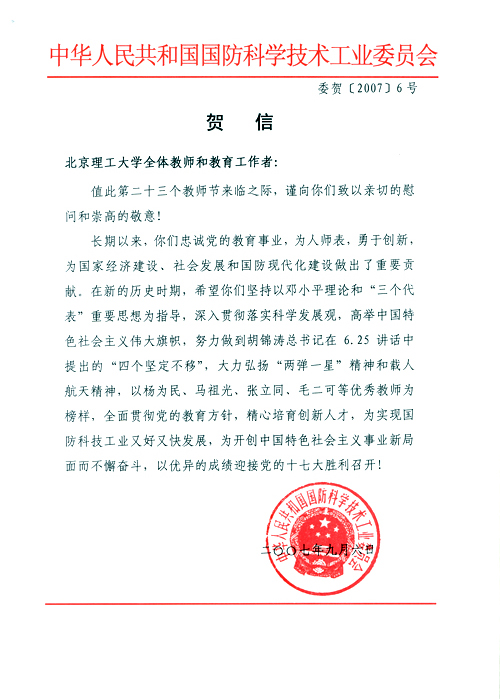 9月6日,国防科学技术工业委员会向我校全体教师和教育工作者发来贺信,庆祝第二十三个教师节的到来。