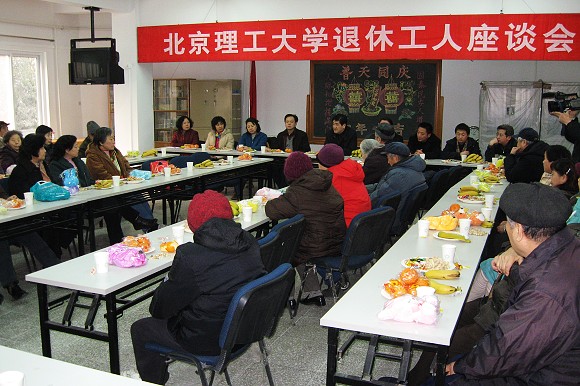2008年1月18日下午,学校召开了退休工人座谈会。参加会议的有副校长赵显利,直属单位党委书记王悦音,后勤集团党委书记巫后新,党办副主任张瑜,人事处副处长黄晓鹏,国资处副处长谷千军及有关单位的负责人。居民管理委员会主任韩棋同志主持会议。