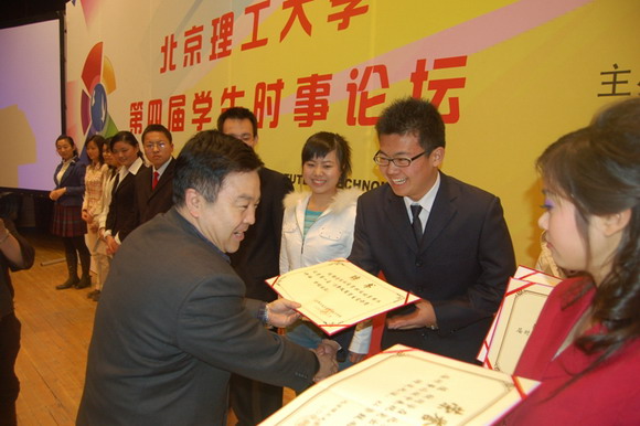 大学生杂志社副总编李晓光、时事报告杂志社副主编张旭、中央人民广播电台网络中心副主任伍刚、人文社会科学学院院长张红峻、人文社会科学学院教授赵和平、理学院党委书记何明、材料学院党委书记张德平分别为获得单项奖的同学颁奖。党委副书记、副校长杨宾和中华人民共和国前任驻伊朗大使华黎明分别为本届论坛坛主晓明同学颁发了奖状和证书。