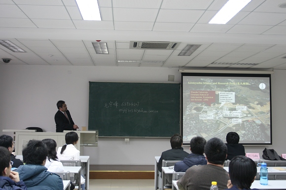 2007年12月21日,日本早稻田大学信息生产系统研究院院长Hirasawa教授学术报告会与两校协议奖学金项目介绍活动在我校研究生楼举行。本次活动由我校国际交流合作处、研究生院和信息科学技术学院联合举办,目的在与进一步推动我校与日本早稻田大学之间的学术交流和两校间协议研究生奖学金项目的开展。本次活动受到了我校学生的热烈欢迎。
