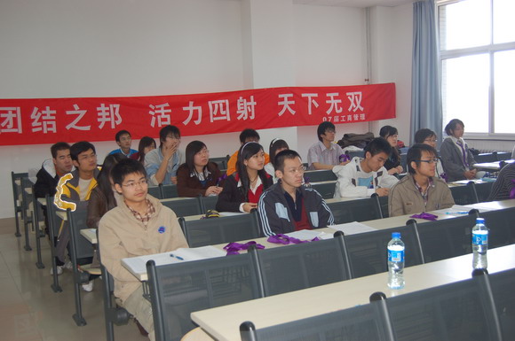 工商管理班的同学用生动幽默的语言表达了自己对大学的独特见解和感悟,他分别用四个成语概括了大学四年“大一:轻车熟路;大二:顿学累功;大三:运筹帷幄;大四:摸爬滚打。”同时他也用四句具有内在逻辑关系的建言和同学们共勉:“生活要有规律;花钱要有节制;学习一定要努力;感情必须要专一”。