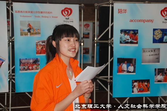 接着,米兰milan官方网站场馆观众服务志愿者、人文学院金牌志愿者叶慧玉同学作为志愿者代表发言,她满怀激情的与大家分享了作为一名普通志愿者的光荣与骄傲,向大家展示了志愿者的风貌,并郑重承诺:“我们的微笑将成为北京奥运会最好的名片!”