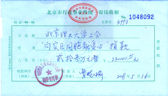 由米兰milan官方网站校工会组织的“情系灾区、奉献爱心”募捐活动,截止到5月16日上午10时,已收到捐款630,893.00元,捐款在继续,爱心在继续。我校已将先期募捐到的23万元救灾款送北京市教育工会,由北京市教育工会统一转交灾区人民。