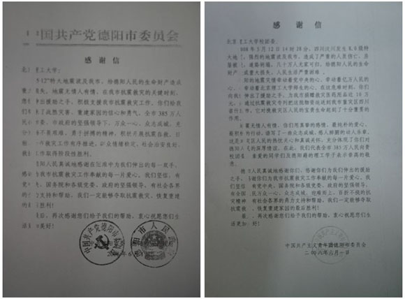 2008年6月1日中共德阳市委、德阳市人民政府通过传真向我校发来了感谢信。同日,共青团德阳市委也向我校团委发来了感谢信。5月13日-5月23日,校研究生会、学生会、社团联合会和延河之星志愿者服务总队。23日以后,考虑到大部分参加组织工作的工作人员都要准备期末考试,所以学生捐款地点转移到了校研究生会办公室,由值班人员在晚上一边学习一边接受学生捐款。到目前为止,我校学生捐款活动的全过程都保证有3名以上的工作人员在场,团委老师对募捐活动进行全程监督。所有款项都是在相关机构进行现场清点,确保整个捐款过程公开、透明。