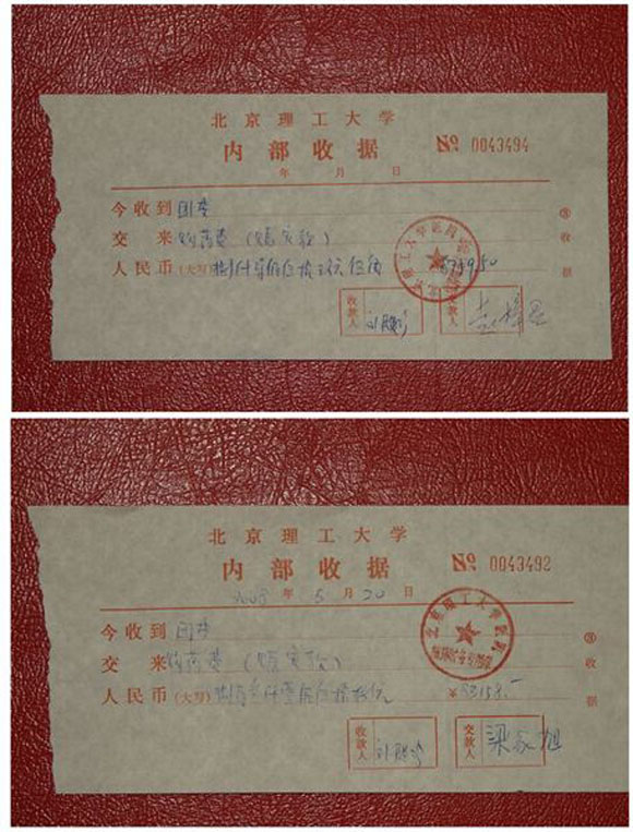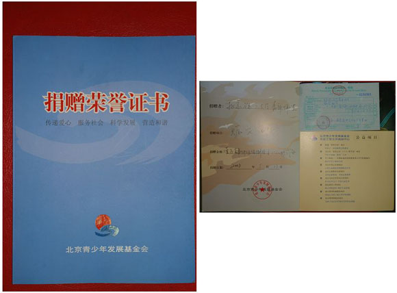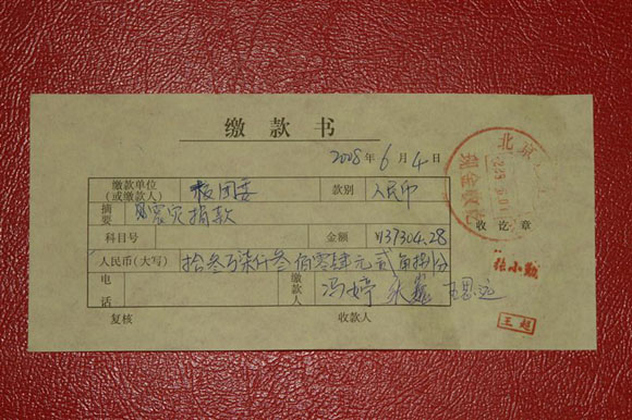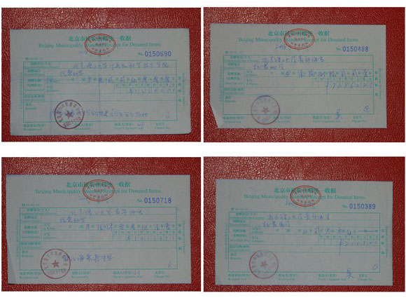 北京市青少年发展基金会为每一笔捐款都开具了收据,六次送款共计283386.04元。