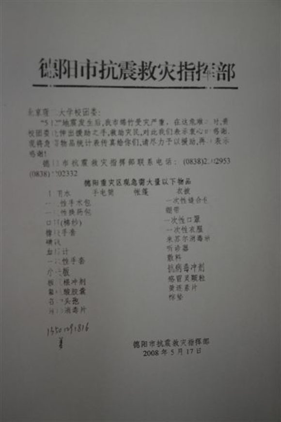 5月17日,四川省德阳市抗震救灾指挥部的同志通过在我校就读的学生反映了德阳市的受灾情况,并以抗震救灾指挥部的名义向我校团委发来了公函,在上面列出了急需救灾物资(主要为医疗物资)的详单。