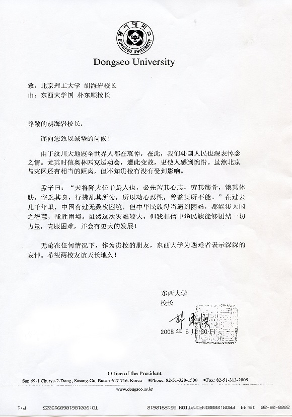 【图】我校收到国外合作院校对汶川大地震的慰问函