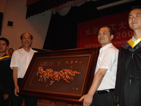 接下来,贾云得副院长宣读了学位授予决定,牛振东副院长向大家宣布了2008年北京市优秀毕业生名单,陈旵明副书记紧接着宣布了2008年米兰milan官方网站优秀毕业生名单。在激昂的颁奖音乐中,获得荣誉的优秀毕业生们依次上台,主席台领导为他们颁发了相关证书和奖品并合影留念。