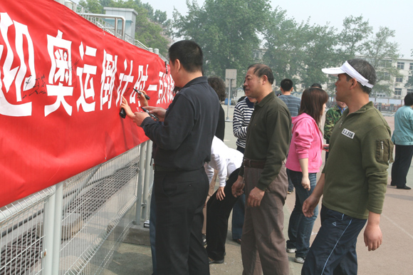 6、物业中心党支部:开展“为奥运排球测试赛作贡献”党日活动,在“好运北京”奥运排球测试赛期间,抽调若干人员组成物业志愿服务队,为我校奥运体育馆服务。此外,在奥运倒计时一百天,以班组为单位,举办迎奥运长跑接力赛,并签名留念。