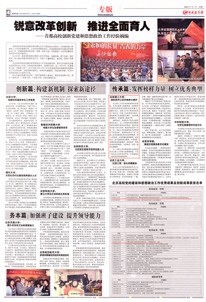 2006—2007年北京高校党的建设和思想政治工作优秀成果奖日前揭晓,我校申报的项目《切实发挥榜样作用,增强党的建设和师德建设的实效性——毛二可院士及其创新团队先进事迹影响深远》荣获优秀成果一等奖,《永葆先进性长效机制的创新成果:“党群零距离”工程》荣获优秀成果三等奖。